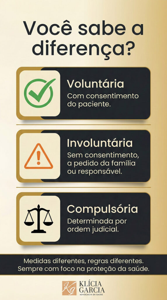 Inclusive, o próprio Senado Federal apresenta essas diferenças de forma clara ao explicar as regras aplicáveis à internação involuntária e compulsória, reforçando que se tratam de medidas excepcionais, sempre vinculadas à proteção da saúde e dos direitos fundamentais.